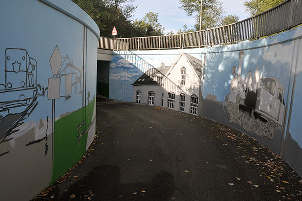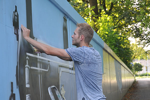 Bijna twee jaar nadat het tunneltje onder de Rondweg in Dokkum is geknapt, maakt de 25-jarige Duco de Boer uit Dokkum het tunneltje pas echt helemaal mooi. Sinds twee weken is hij bijna iedere dag bezig met het aanbrengen van een graffiti kunstwerk. Helemaal geïnspireerd op oude foto's van het Dokkumer Lokaeltsje is de Dokkumer in de weer met bussen graffiti, schilderstape en verf om het tunneltje tussen de Aalsumerweg en de Stationsweg voor eens en voor altijd op te sieren. Aanbod Duco is geen onbekende in Dokkum als het gaat om legale graffiti. Hij zorgde er eerder voor dat het tunneltje in het Damwâldsterreedsje helemaal werd bespoten. Dat kunstwerk hield helaas geen stand en de jonge artiest bood zich daarom aan bij de gemeente Dongeradeel om daar opnieuw mee aan de slag te gaan. De gemeente had wel oren naar zijn aanbod, maar dan vooral om het tunneltje onder de Rondweg van graffiti te voorzien. "Er komt een speciaal laagje over de tekeningen heen, zodat eventuele overschilderingen makkelijk kunnen worden verwijderd", aldus Duco. Bedrijfje De 25-jarige Dokkumer zou graag fulltime met het legaal aanbrengen van graffiti aan de slag willen gaan. Hij staat ingeschreven bij de Kamer van Koophandel en voerde ook in Leeuwarden al enkele opdrachten uit. "Alleen in de winter is het wel lastig", vertelt de Boer. Het is dan niet te doen om buiten aan de slag te gaan. Wanneer hij met het tunneltje in Dokkum helemaal klaar is? Dat durf de Boer nog niet te zeggen. "Het vordert gestaag", zegt een voorbijganger die iedere dag langs het tunneltje komt. "Gestaag inderdaad", zegt Duco terug met een glimlach. Het is allemaal iets meer werk dan verwacht nu de jongen die hem met het project zou helpen ziek werd en de Boer er alleen voor staan: "Maar het komt af". Lees ook: Opknappen tunnel Aalsumerweg in volle gang Tunneltje bij Aalsumerweg wordt flink opgeknapt