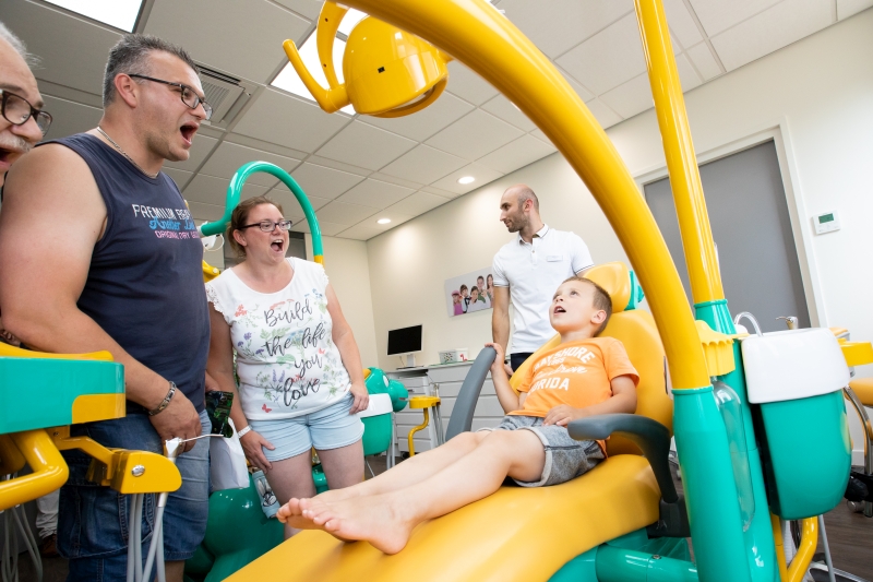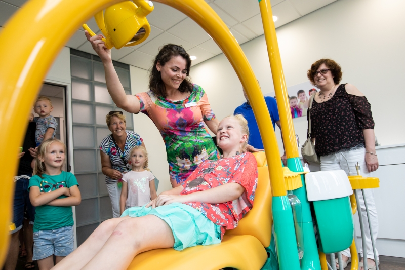 Vrijdagmiddag 1 juni zijn de deuren van de nieuwe kinderzone in tandartspraktijk De Woudvaart in Dokkum officieel geopend. Kinderburgemeester Aukje Miedema verrichtte de feestelijk opening door het lint door te knippen. Aansluitend werd een open huis met een hapje en een drankje gehouden en waren er diverse activiteiten voor kinderen. Gericht op kinderen De nieuwe kinderzone is een speciaal ingerichte naar de wensen van kinderen en voorzien van de meest innovatieve apparatuur en speciale kinderbehandelstoelen. Het jonge publiek kon op deze dag ook direct ervaren dat een bezoekje bij de tandarts helemaal niet eng is. Daarnaast werden er diverse activiteiten voor kinderen georganiseerd, waaronder een groot springkussen, een kleurplaatwedstrijd en nog veel meer spelletjes waar kinderen prijzen mee konden winnen. Ook kon er kennis gemaakt worden met het team van tandartspraktijk De Woudvaart. Iedereen die zich inschreef, kreeg bij de eerste tandartscontrole gratis een entreekaartje cadeau Dinoland in Zwolle, een van de leukste pretparken in Nederland! Deze actie blijft via de website van de tandarts: www.dokkumtandarts.nl ook nog een tijdje geldig. Specialisten Tandartspraktijk De Woudvaart heeft een deskundig team dat bestaat uit tandarts Marska, twee mondhygiënisten en een aantal goed gekwalificeerde preventieassistentes. Tandarts Marska heeft meer dan twintig jaar werkervaring, o.a. op het gebied van orthodontie en andere diverse behandelingen bij kinderen. “Mijn team is erop getraind om de tandartservaring van uw kind met zo min mogelijk stres te laten ervaren”, vertelt de tandarts. “Dit doen we door de kinderen te laten wennen aan de praktijk en de behandelingen.” Bij De Woudvaart kunt u terecht voor alle preventieve behandelingen, onder het mom van ‘voorkomen is beter dan genezen.’ Foto's: Marit Anker