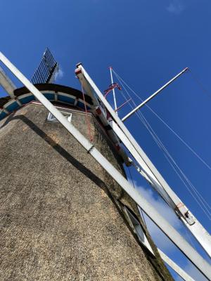 De Stichting Monumentenbehoud Dongeradeel zat eind 2020 even in een dip, maar vrijdag 28 mei ging de vlag in top van korenmolen ‘De Hoop’ als hoopvolle doorstart en voor een hopelijk mooie toekomst voor deze weer springlevende stichting. Het stichtingsbestuur werd afgelopen periode aangevuld en er kwam een nieuwe stichtingsvlag met vlaggenmast, aangeboden door de Dokkumer Vlaggen Centrale. Foto v.l.n.r.: Ab van der Veen, Henk van der Veen, Warner B. Banga en Marc de Jager (directeur DVC) Nieuwe bestuursleden De stichting bezit en beheert zeven molens en zesentwintig kerktorens uit de voormalige gemeente Dongeradeel, die nu onder de gemeente Noardeast-Fryslân valt. Na zorgen over de toekomst van het monumentenbeleid en -behoud in de nieuwe gemeente Noardeast-Fryslân lukte het Wim Megens tijdens de corona-crisis toch om drie nieuwe bestuursleden te werven. Naast bestuurslid Ab van der Veen – die zich beschikbaar stelde voor een tweede termijn voor technische zaken en torenonderhoud – zijn dat Henk van der Veen als nieuwe voorzitter en Lolke Folkerstma, die als penningmeester op de centen gaat passen. Warner B. Banga neemt de molenzaken en coördinatie van de vrijwillige molenaars voor zijn rekening. Tot slot verricht Marco Feenstra ambtelijke ondersteuning vanuit de gemeente. Het stichtingsbestuur is overigens nog steeds op zoek naar enkele bestuursleden, onder andere voor de PR. Desondanks kan de vlag nu weer uit voor monumentenbehoud in het gebied van voormalig Dongeradeel. Stichtingsvlag en vlaggenmast Al enige jaren leefde binnen de stichting de wens om op met name de molens een eigen vlag te kunnen laten wapperen tijdens bijvoorbeeld Molendagen, maar door de komst van een nieuwe gemeente en de corona-pandemie bleef dat lange tijd liggen. Oud-bestuurslid en vrijwillig molenaar Karel Jongsma ontwierp op basis van het stichtingslogo de nieuwe blauwgroene vlag en bestelde voor elke molen een exemplaar bij de plaatselijke vlaggenfabrikant. Tijdens een zomerstorm brak in juli 2020 plotseling de vlaggenmast van molen ‘De Hoop’ met daarin de ‘Met elkaar, voor elkaar!’-vlag van DVC. Nadat contact was opgenomen, bood de Dokkumer Vlaggen Centrale spontaan aan om de mast op de Dokkumer stellingmolen te vervangen door een spiksplinternieuw houten exemplaar van zes meter lengte. Deze is de afgelopen week tijdens reparatiewerkzaamheden aan de rietbedekking van de romp weer achter op de kap van de molen geplaatst. Uiteraard is het stichtingsbestuur in zijn nopjes met de nieuwe vlaggenmast. Die reparatie van stormschade aan de rietbedekking loopt vooruit op een uitgebreidere restauratie van molen ‘De Hoop’ en de Hantumermolen, die na de zomervakantie zullen plaatsvinden; en dat is hoognodig, want stichtingsbesturen kunnen misschien even met de handen in het haar zitten, maar het verval en de noodzaak van onderhoud staan nooit stil! Een stilstaande molen is echter vaak een ‘dode’ molen en gaat snel achteruit.